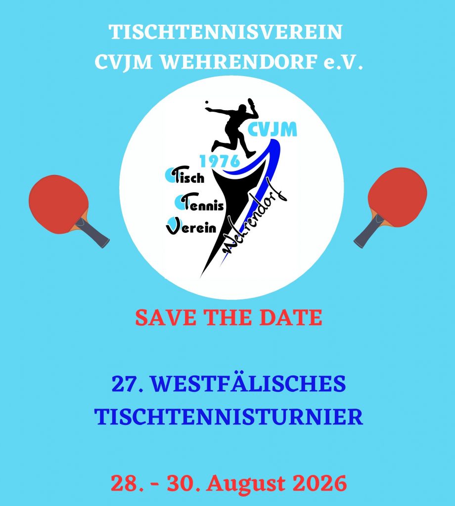 Auch in diesem Jahr findet am letzten Ferienwochenende in NRW vom 28. – 30. August 2026 unser allseits beliebtes Westfälisches Tischtennisturnier in Vlotho statt.